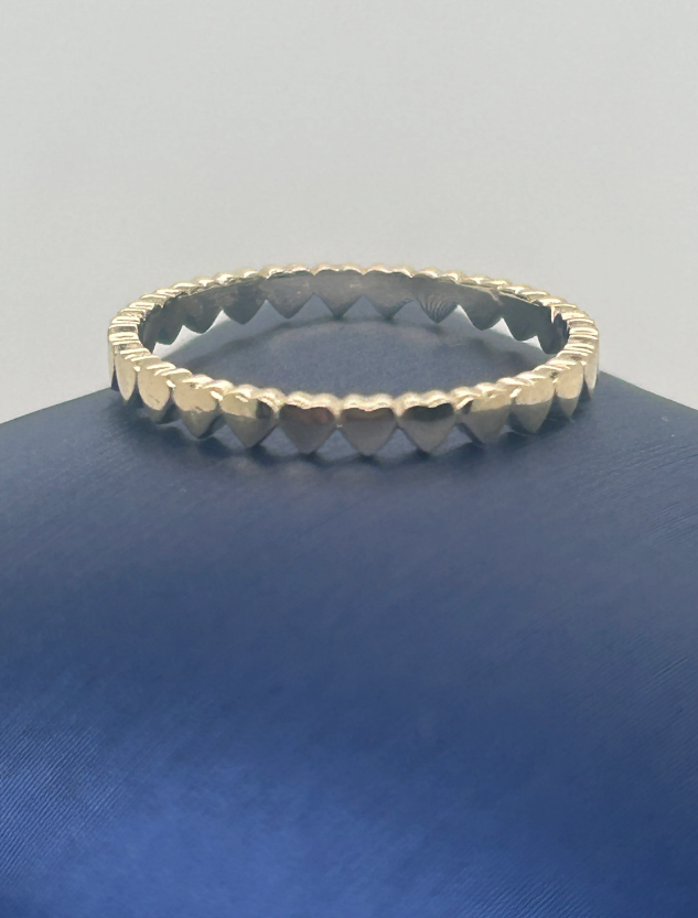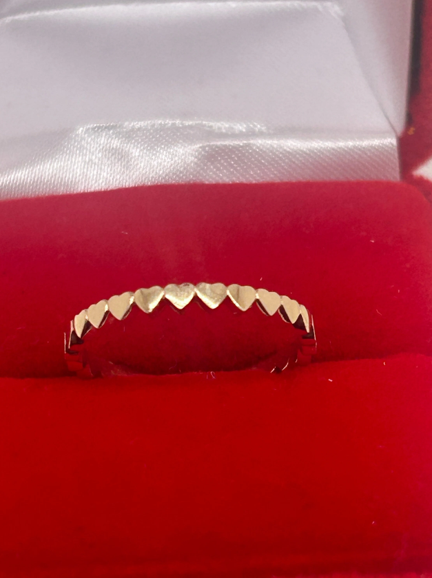 This exquisite ring features a continuous line of hearts, crafted from 18K solid gold, symbolizing the infinite nature of love. The hearts are expertly set in a elegant channel setting, creating a seamless flow of gold and sparkle.