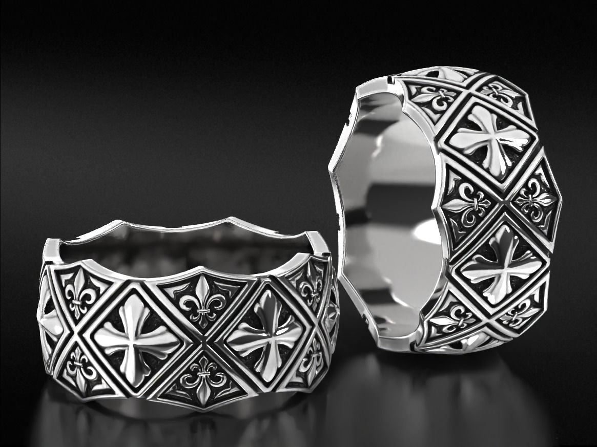 14K Solid Gold Wedding Band with Maltese Cross and Fleur-De-Lis / Gold Cross Ring / Solid Gold Wedding Band with Cross / Unisex Ring