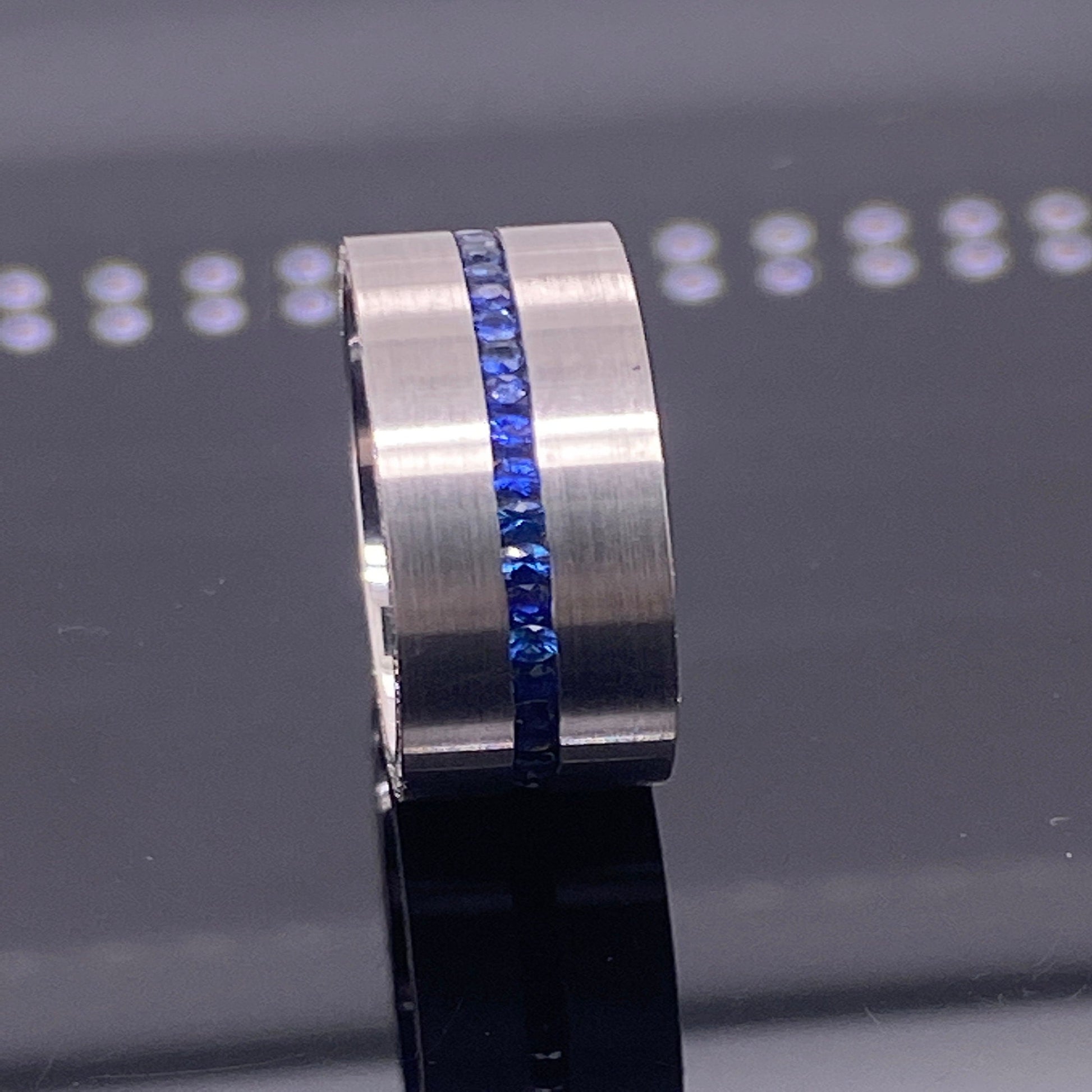 18K Solid White Gold Flat Top 8mm Width Eternity Wedding Band with Natural Sapphires In the Center White Diamonds on the Sides/ Men's Band